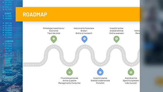 Vei învăța despre investițiile active sau trading ce îți pot aduce câștiguri indiferent de direcția de evoluție a piețelor. Vom studia analiza tehnică. Vei învăța cum interpretezi graficele, cum recunoști trendurile, să știi când să intri și când să ieși din piață, vei învăța indicatorii specifici, șabloanele și tot ce este necesar pentru a lua cele mai bune decizii în toate operațiunile tale.